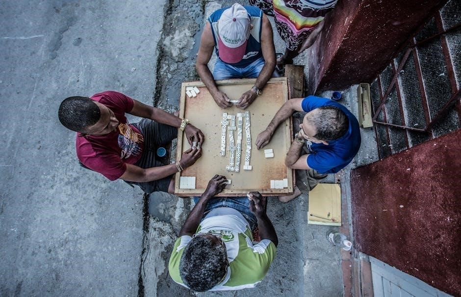 Block Dominoes is a popular variation where players start with a set number of tiles, typically three to seven, depending on the number of players. The goal is to be the first to lay down all your tiles. Players take turns matching tiles to the ends of the line, similar to standard dominoes. If a player cannot make a move, they must pass their turn; The game ends when one player runs out of tiles or no legal moves are left. Points are scored based on the total pips left in opponents’ hands. Block Dominoes emphasizes strategy, as players must carefully plan their moves to outlast opponents. Official rules are outlined in dominoes game guides, ensuring clarity for players; This variant is known for its simplicity and fast-paced nature, making it a favorite among dominoes enthusiasts. Mastering tile counting and memory can give players a competitive edge in this thrilling game.