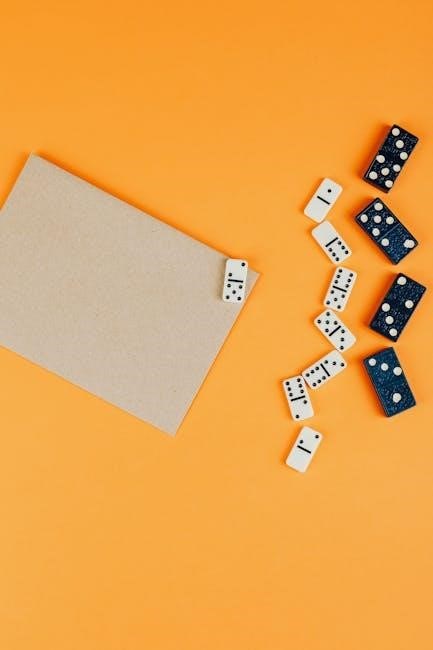The dominoes rules PDF provides a comprehensive guide to understanding the game. It typically includes detailed explanations of setup, gameplay, and scoring systems. The guide is structured clearly, with sections on basic rules, variations, and advanced strategies. Visual aids like diagrams and illustrations often accompany the text to clarify complex concepts. The PDF also outlines penalties and foul play, ensuring players adhere to official standards. Many guides include examples of common scenarios to help learners grasp the rules practically. The document is designed to be user-friendly, with clear headings and an index for easy navigation. Whether you’re a beginner or an experienced player, the PDF offers a valuable resource to enhance your understanding of dominoes.
