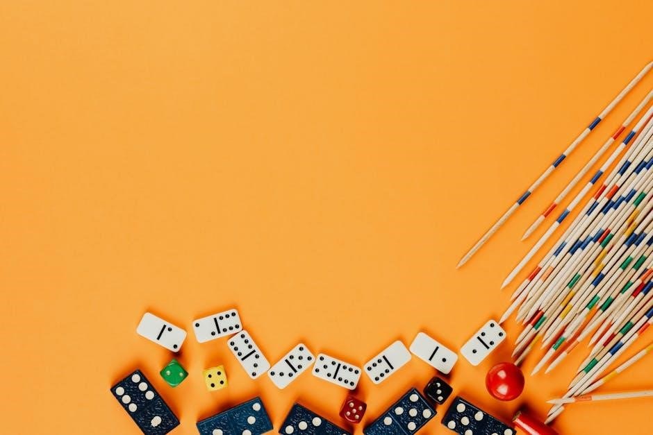 The dominoes game is a classic tabletop activity played with 28 tiles, each featuring pairs of numbers from 0 to 6. The objective is to place tiles in a specific order, earning points based on opponents’ inability to play. The game is simple yet strategic, with variations like Five-Up and Chicken Foot offering unique twists. Players can download an official Dominoes Game Rules PDF to learn detailed instructions, strategies, and variations. This guide covers basic rules, setup, and scoring systems, making it ideal for both newcomers and experienced players. Whether you’re playing solitaire or with friends, the PDF ensures a clear understanding of the game’s fundamentals and advanced techniques.
